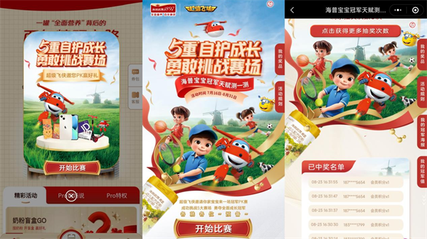 同时,海普诺凯还带来了为小朋友们加油鼓劲的“运动搭子”——联手备受欢迎的超级飞侠IP,推出创意H5活动,开启宝宝未来赛场畅想。活动里,宝宝们在 “全面高阶营养,五重自护成长”的守护下,激发不同的运动潜力,成为闪耀成长赛场的冠军宝宝。