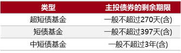 而在债券基金投资中常看到的“短债基金”“中短债基金”等不同类型,其实指的是债券基金主投债券的剩余期限,也就是债券距离最终还本付息的时间长度。