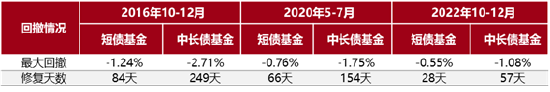 回顾近年来三轮较大的债市调整,可以发现,短债基金的最大回撤整体显著小于中长债基,修复回撤所需时间也明显更短。