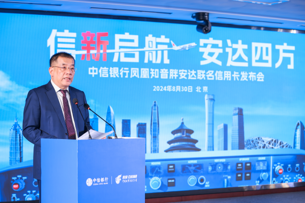 (2024年8月30日,北京今日,中信银行携手中国国际航空公司(以下简称“国航”在北京中信大厦召开发布会,全新推出“中信银行凤凰知音胖安达联名信用卡”,为广大商旅人士和旅游爱好者带来便捷、舒适、有温度的出行消费新体验。此次合作依托中信银行金融服务的特色优势,以及国航的航旅出行卓越服务体验,双方再度携手,面向国内年轻的商旅用户客群,全新升级“金融 商旅”生态服务体系。新品发布会现场,中信集团副总经理、中信银行董事长方合英,中航集团总经理、党组副书记王明远,中信银行党委委员、副行长吕天贵,国航商务委员会主任、党委副书记梁爽,中信银行信用卡中心总裁李志涛,国航商务委员会副主任、党委委员崔红强等双方高层代表出席,共同为新品揭幕。