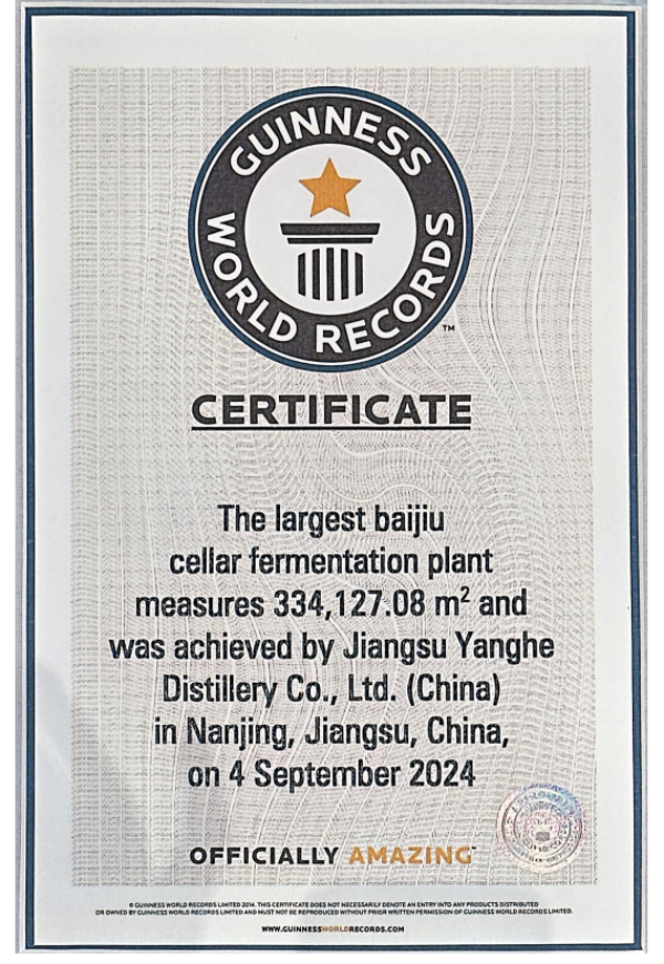 这份吉尼斯世界纪录认证的背后,凝聚的是洋河“老窖池、老工艺、老酒”,7万口窖池和2020口明清老窖,涵盖35道工序和137道工艺的 “224335” 非遗绵柔酿酒技艺,100万吨的原酒储存能力。也正是因为庞大的产能、储能和规模,洋河创造了“固态酒产能、高品质原酒储能、陶坛储酒规模、 绵柔年份老酒体量”均居世界第一的领先地位,让洋河有能力去“百里挑一、千里挑一、万里挑一”做真实年份老酒,有底气 “用料不计成本、用工不计代价、用时不计岁月”打造“中国高端年份白酒”。