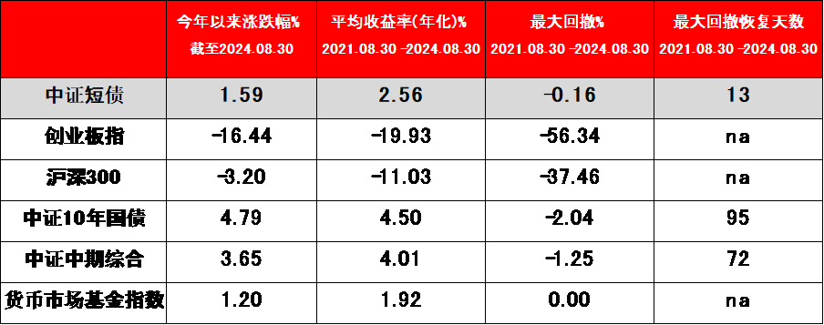 让我们用数据来证明。截至2024年8月30日,中证短债近3年平均年化收益率2.56%,而同期沪深300指数的平均年化收益率为-11.02%。从风险的角度看,中证短债近3年最大回撤-0.16%,最大回撤恢复时间13天;而同期,中证中期全债指数及中证10年国债指数,最大回撤恢复时间分别为72天和95天(具体数据详见下表。