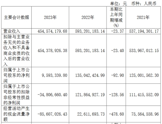 2023年,公司公司实现营业收入4.55亿元,同比下降23.37%;归属于上市公司股东的净利润959.33万元,同比下降92.90%;归属于上市公司股东的扣除非经常性损益的净利润-3480.67万元,上年同期为1.22亿元;经营活动产生的现金流量净额为-8560.70万元,上年同期为2261.17万元。