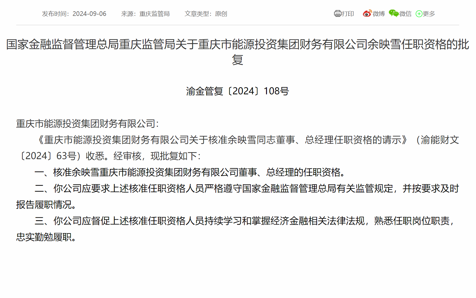 余映雪获批出任重庆市能源投资集团财务公司总经理 更新时间:2024-09-06 13:21:24 •阅读 0 财经9月6日讯 今日,国家金融监督管理总局重庆监管局公布相关批复信息时表示,核准余映雪重庆市能源投资集团财务有限公司(简称:重庆市能源投资集团财务公司董事、总经理的任职资格。以下是相关批复正文: