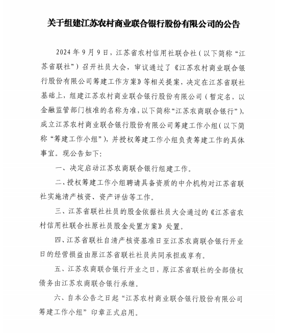 公告提到,授权筹建工作小组聘请具备资质的中介机构对江苏省联社实施清产核资、资产评估等工作。江苏省联社社员的股金依据社员大会通过的《江苏省农村信用社联合社原社员股金处置方案》处置。江苏省联社自清产核资基准日至江苏农商联合银行开业日的经营损益由原江苏省联社社员共同承担或享有。江苏农商联合银行开业之日,原江苏省联社的全部债权债务由江苏农商联合银行承继。自公告之日起“江苏农村商业联合银行股份有限公司筹建工作小组”印章正式启用。