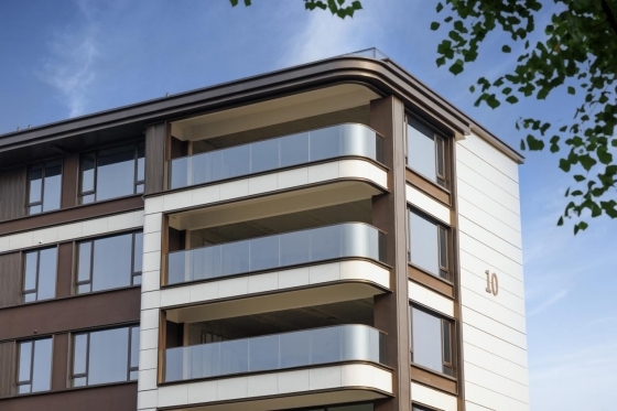 目前,部分洋房楼栋的立面基本实景呈现,以白色和棕色为主色调的现代高奢风格,大面积定制玻璃,搭配金属铝板、奢石等材料,在阳台和部分端体进行弧形倒角处理,线条流畅,典雅耐看。