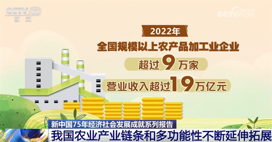 随着乡村振兴战略深入实施,我国农业产业链条和多功能性不断延伸拓展。2022年全国规模以上农产品加工业企业超过9万家,营业收入超过19万亿元。