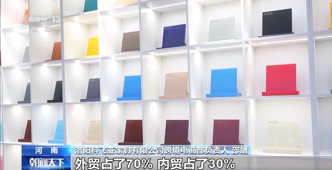 洛阳科飞亚家具有限公司跨境电商部负责人 邵靖:原来我们内贸和外贸业务占比是7比3 ,因为去年我们成立了跨境电商这个部门,实现了一个反转,外贸占了70%,内贸占了30% 。