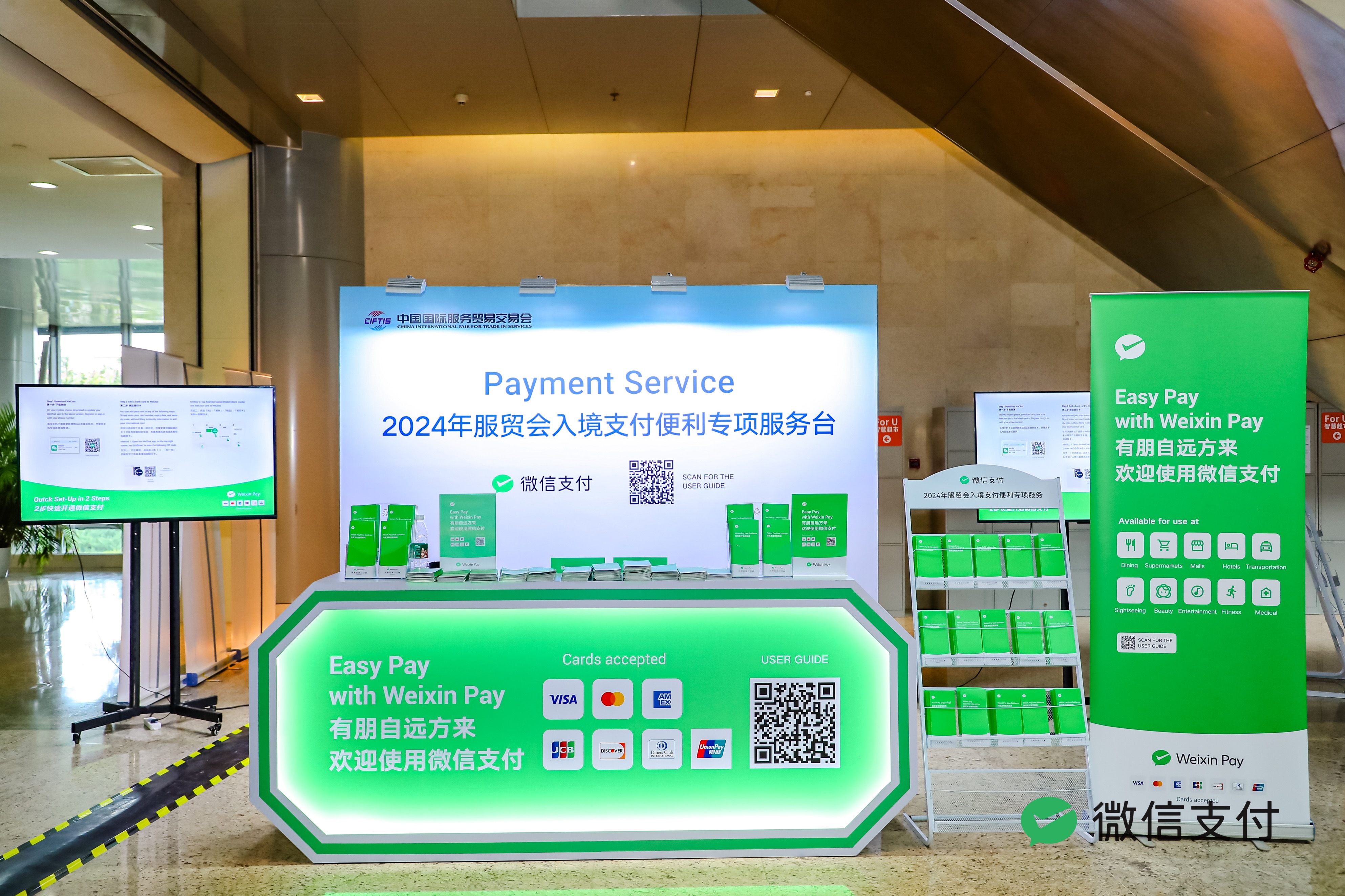 其中,在国家会议中心,为便于服务参加国别展、成就展等综合展、以及各类贸易峰会的来宾,服贸会与腾讯微信支付等合作,现场设置“入境支付服务咨询台”,让外籍人士在服贸会现场体验更便利的移动支付。