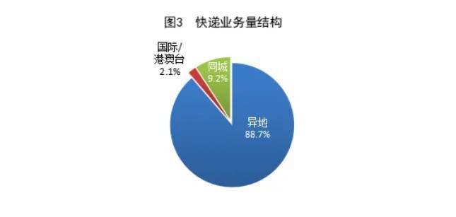 1-8月,同城、异地、国际/港澳台快递业务量分别占全部快递业务量的9.2%、88.7%和2.1%。与去年同期相比,同城快递业务量的比重下降0.3个百分点,异地快递业务量的比重上升0.3个百分点,国际/港澳台业务量的比重基本持平。