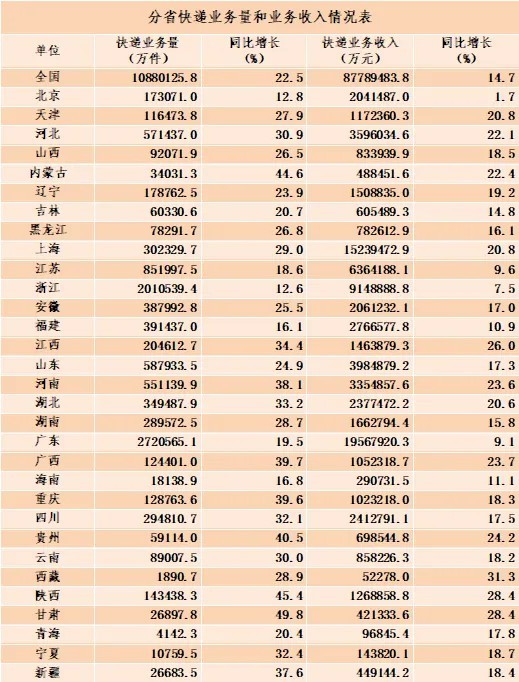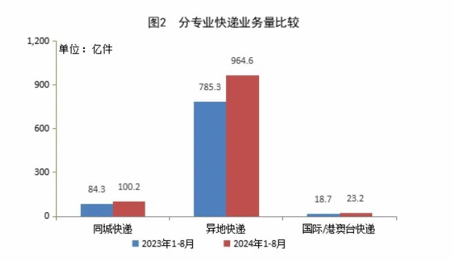 1-8月,同城快递业务量累计完成100.2亿件,同比增长18.9%;异地快递业务量累计完成964.6亿件,同比增长22.8%;国际/港澳台快递业务量累计完成23.2亿件,同比增长24.2%。