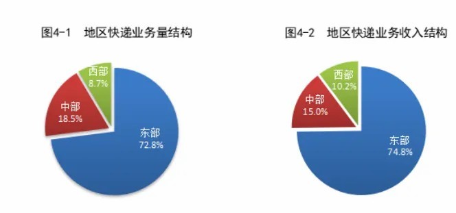 1-8月,东、中、西部地区快递业务量比重分别为72.8%、18.5%和8.7%,业务收入比重分别为74.8%、15.0%和10.2%。与去年同期相比,东部地区快递业务量比重下降2.2个百分点,快递业务收入比重下降1.2个百分点;中部地区快递业务量比重上升1.3个百分点,快递业务收入比重上升0.7个百分点;西部地区快递业务量比重上升0.9个百分点,快递业务收入比重上升0.5个百分点。