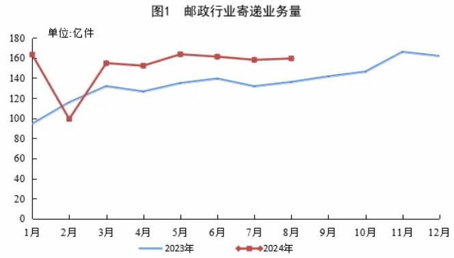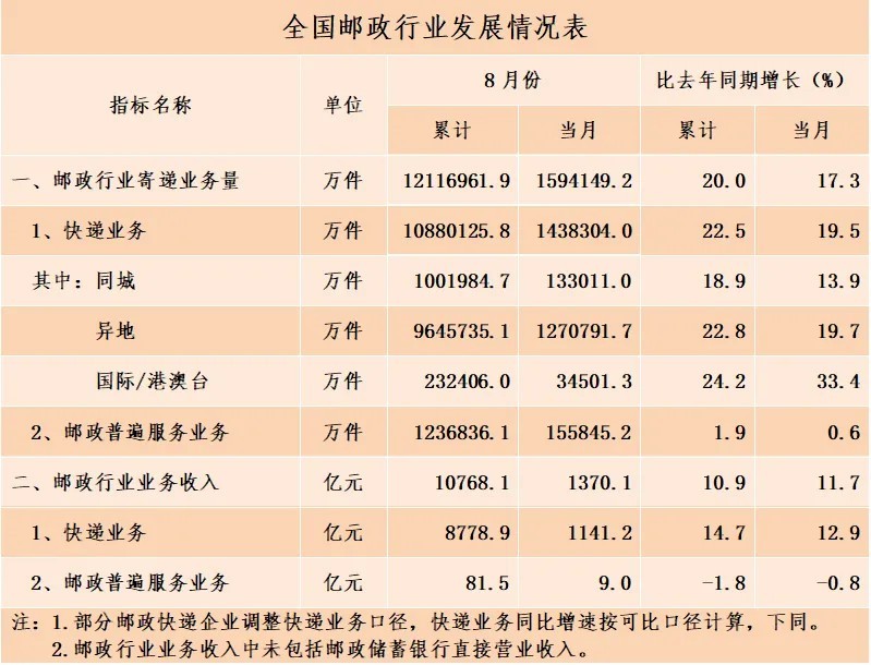 8月份邮政行业寄递业务量完成159.4亿件 同比增长17.3%