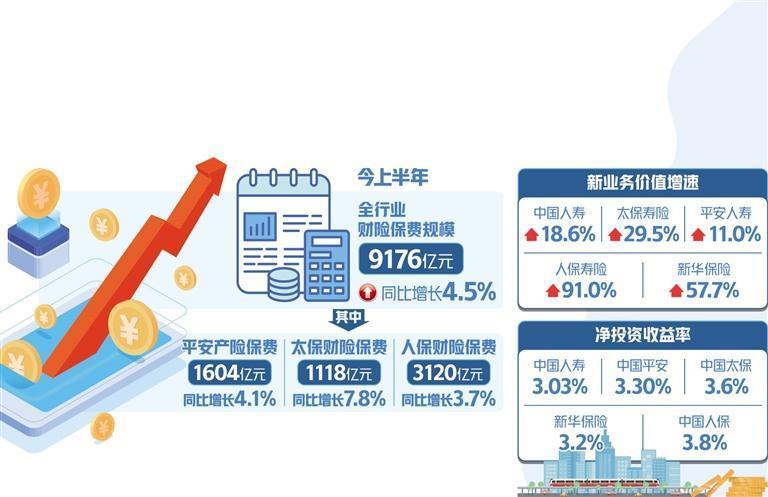 在保险公司的资产端,上市险企上半年投资资产规模稳步增长。净投资收益率跟随长端利率持续下行,中国人寿、中国平安、中国太保、新华保险、中国人保净投资收益率分别为3.03%、3.30%、3.6%、3.2%、3.8%,分别同比下降0.75个、0.2个、0.3个、0.2个、0.6个百分点。同时,总投资收益率明显改善,中国人寿、中国平安、中国太保、新华保险、中国人保分别为3.59%、3.50%、5.4%、4.8%、4.1%。开源证券在研报中分析,总投资收益率改善主要是受益于上半年高股息资产表现较好,且长端利率下行后债券市值上涨。