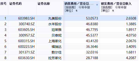一直以来,珀莱雅都被贴上“重营销、轻研发”的标签。根据申万行业分类,A股市场共有8家品牌化妆品公司,珀莱雅的研发费用率位列倒数第3,仅高于水羊股份和敷尔佳;销售费用率位列第3,低于丸美股份和水羊股份。