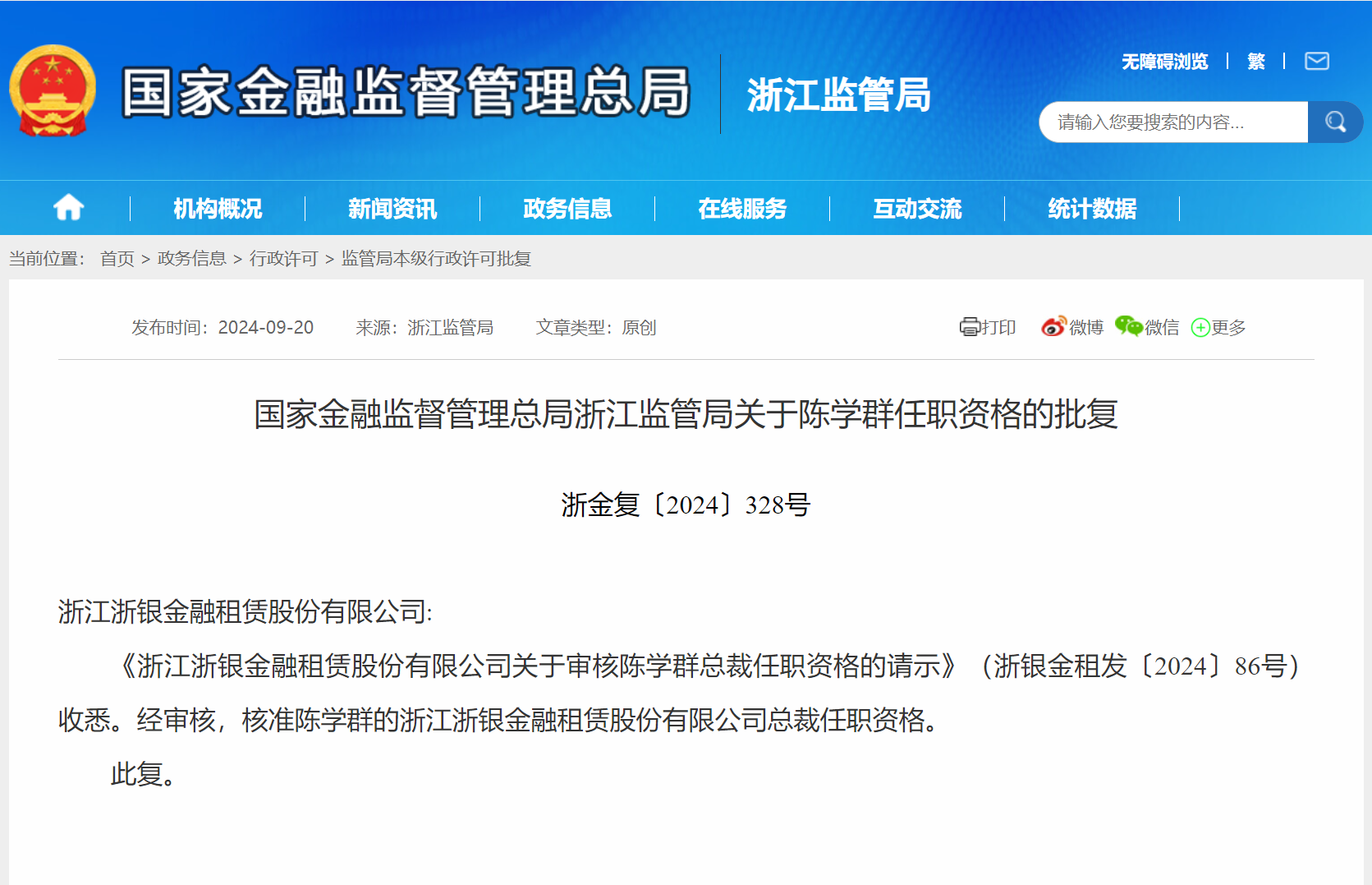 陈学群获批担任浙银金租总裁 更新时间:2024-09-20 15:22:00 •阅读 0 财经9月20日讯 今日,国家金融监督管理总局浙江监管局发布相关批复信息,核准陈学群的浙江浙银金融租赁股份有限公司(简称:浙银金租总裁任职资格。以下是相关批复正文: