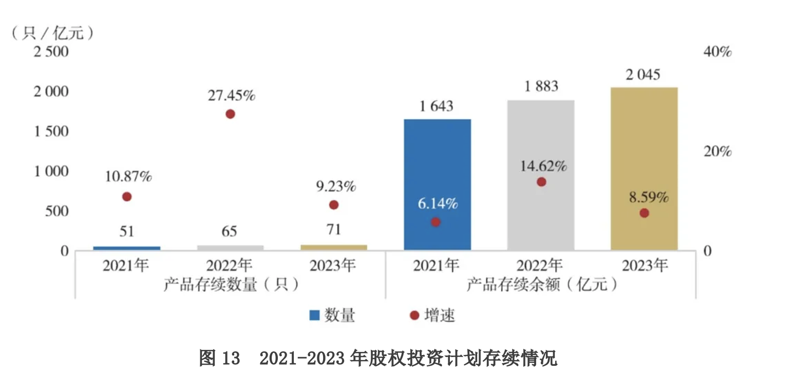 产品存续方面,截至2023年末,股权投资计划存续数量71只,存续余额2045亿元,较上年末增长162亿元,增速8.59%。