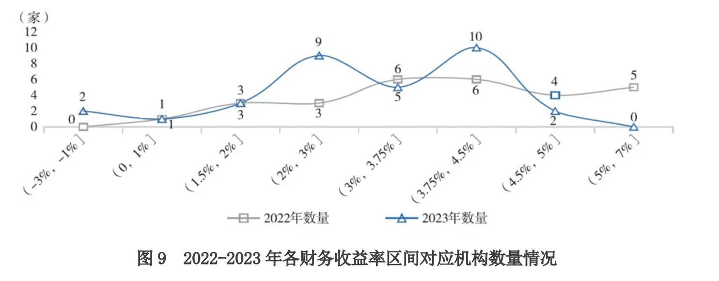 财务收益率个区间机构分布相对集中,10家机构财务收益率区间为(3.75%,4.5%],另有9家为(2%,3%]。