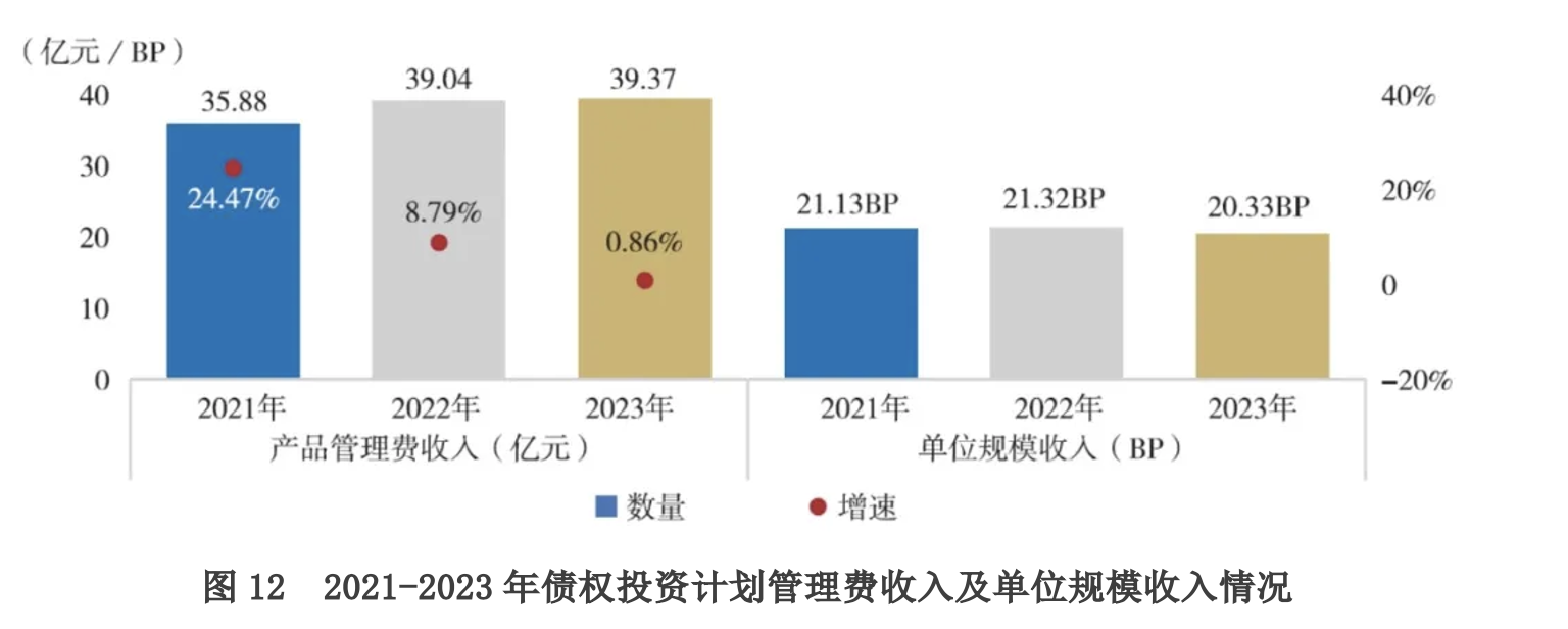 产品收入方面,2023年债权投资计划实现管理费收入39.37亿元,与上年同期基本持平。单位规模收入为20.33BP,较上年减少近1BP。