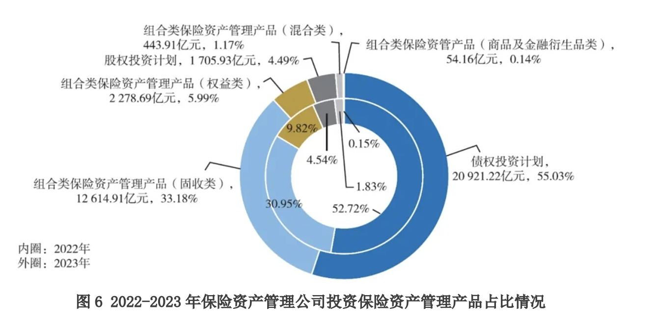 从保险资产管理产品配置结构来看,2023年,行业配置保险资产管理产品规模3.80万亿元,同比增长2.34%。其中,配置债权投资计划2.09万亿元,占比55.03%;配置组合类保险资产管理产品1.54万亿元,占比40.53%;配置股权投资计划0.17万亿元,占比4.49%。