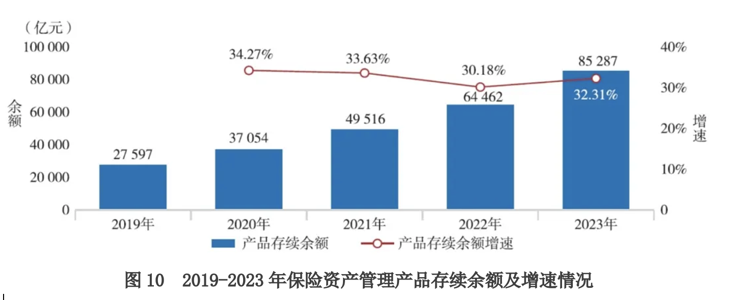 数据显示,截至2023年末,行业保险资产管理产品存续余额8.53万亿元,较上年末增加2.08万亿元,同比增长32.31%,近5年复合增长率为32.59%。