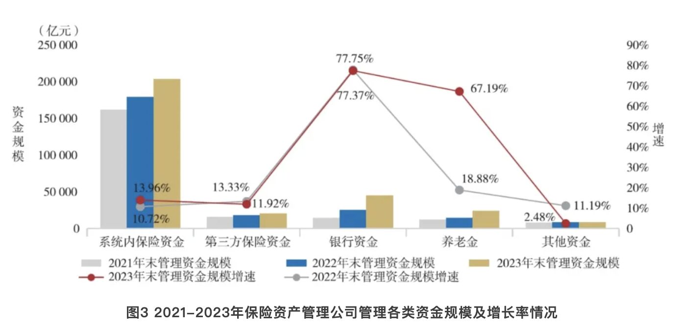 从近3年各类资金规模增速看,保险资金稳步增长,业外资金增速较快。其中,银行资金管理规模同比增长77.37%,增速最快;系统内保险资金增速为13.96%;第三方保险资金增速为11.92%。