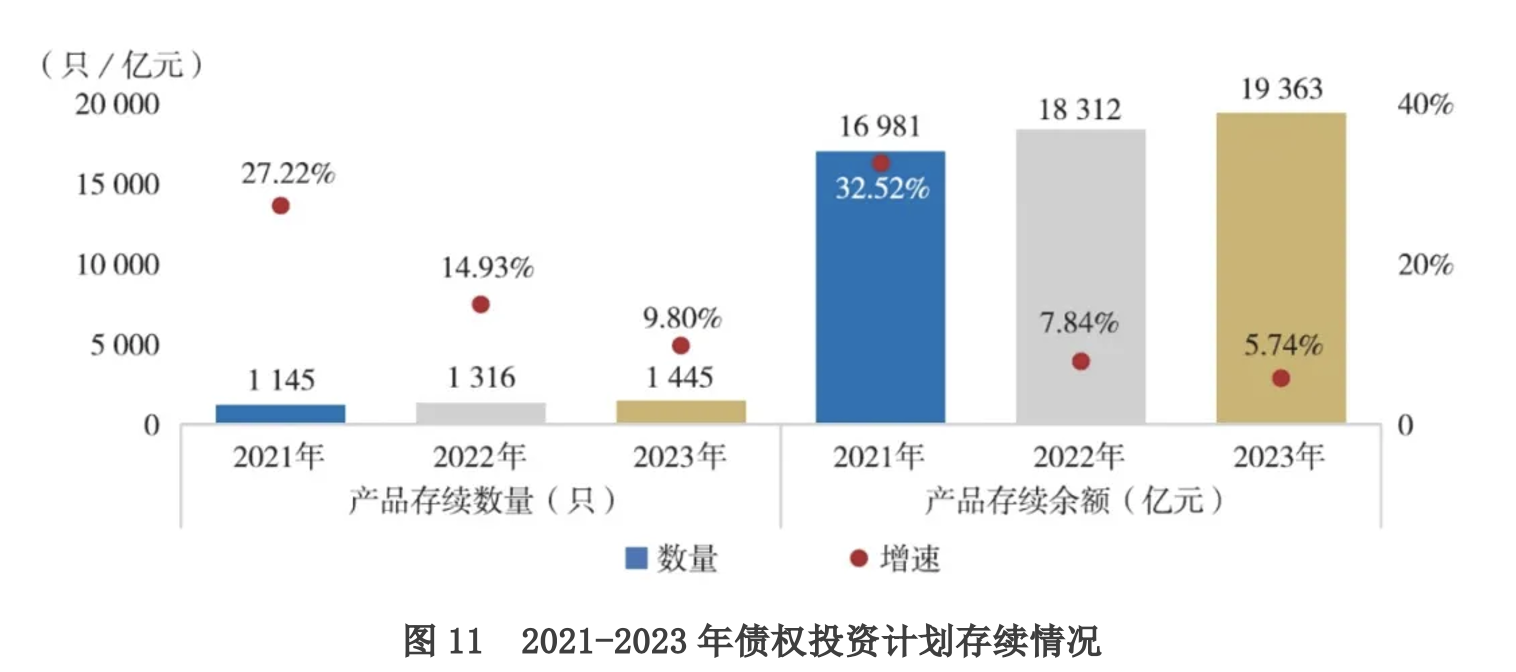 产品存续方面,截至2023年末,债权投资计划存续数量1445只,存续余额1.94万亿元,较上年同期增加1051.11亿元,增长率为5.74%。