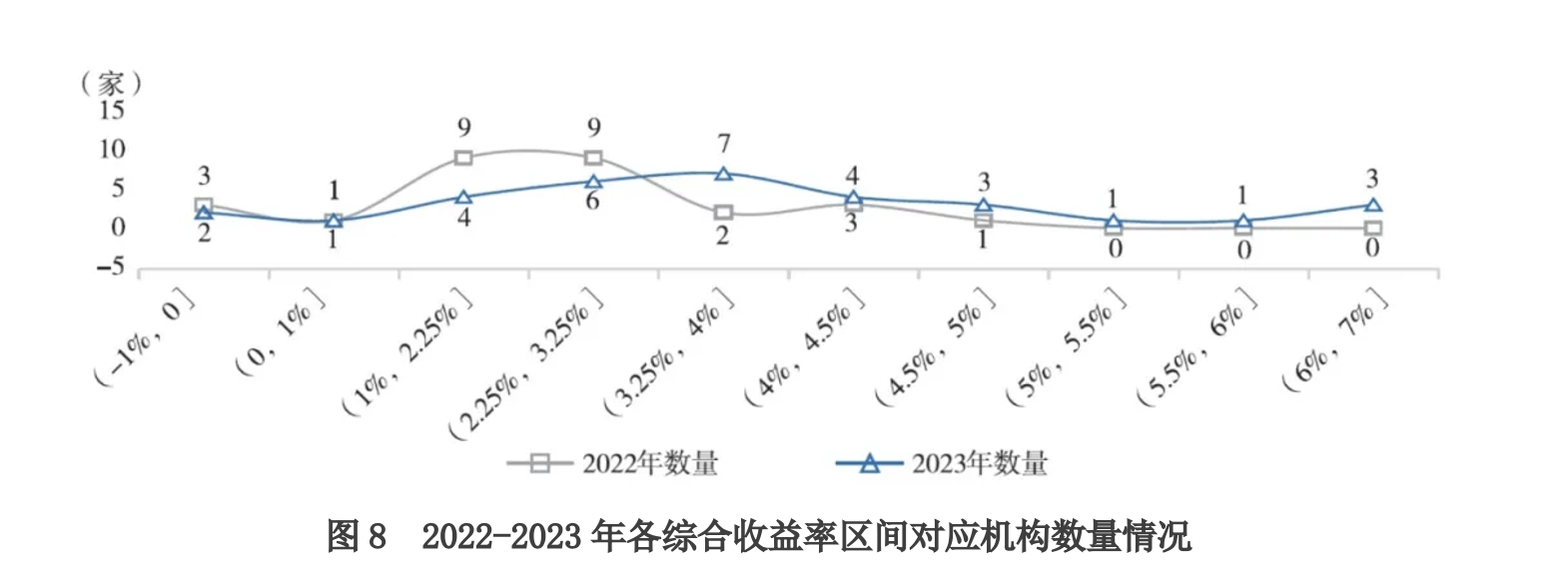 具体来看,2023年综合收益率各区间机构分布较为分散。其中,4家机构2023年综合收益率区间为(1%,2.25],6家机构为(2.25%,3.25%],7家机构为(3.25%,4%],4家机构为(4%,4.5%]。
