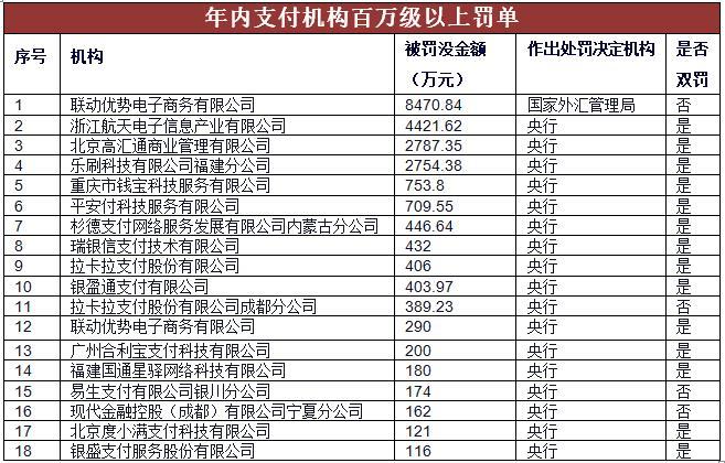 今年以来,第三方支付领域严监管态势不改,大额罚单频频出现。据财经记者不完全统计,截至9月24日,年内第三方支付公司共收到18张百万级(其中包括4张千万级罚单,总额超2.3亿元。