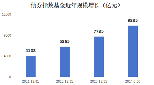 近年来,债券指数基金的规模快速增长。据上海证券、Wind数据,债券指数基金规模由2021年末的4108亿元增长至2024年6月末的9885亿元。仅今年上半年,债券指数基金的规模就增长超2000亿元,较去年末增幅达27%。另据基金定期报告披露,截至上半年末,债券指数基金持有人累计超过600万户,仅上半年增加253万户,人气颇高。