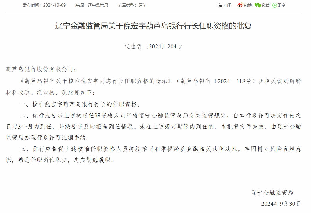 葫芦岛银行行长倪宏宇任职资格获批