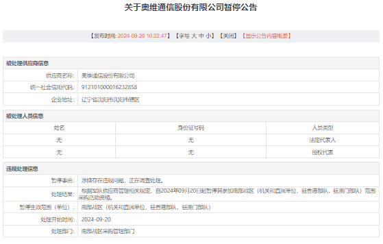 奥维通信涉嫌违规被暂停参加南部战区采购资格