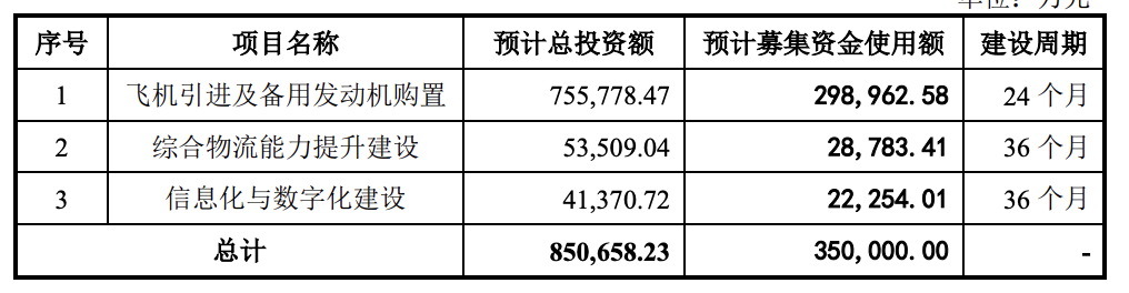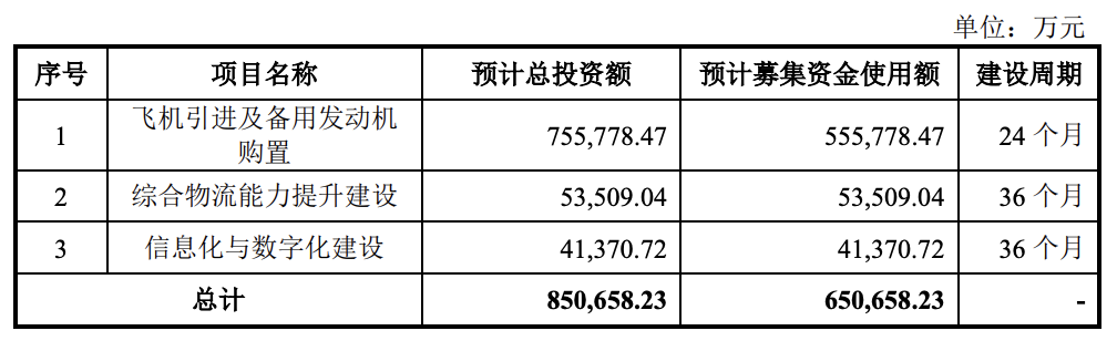 2023年3月3日首次递交的IPO招股书中,国货航预计募资规模为65.07亿元,其中,55.58亿元用于飞机引进及备用发动机购置项目,5.35亿元用于综合物流能力提升建设项目,4.14亿元用于信息化与数字化建设项目。