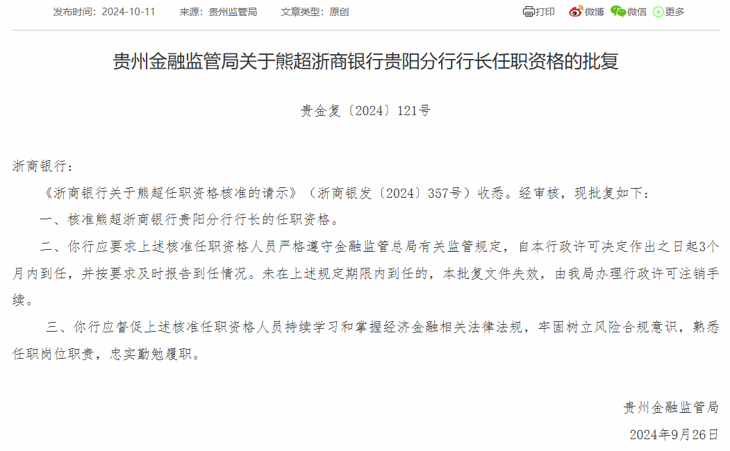 浙商银行贵阳分行行长熊超任职资格获批 更新时间:2024-10-16 11:22:21 •阅读 0 财经10月16日讯 近日,贵州金融监管局披露批复显示,贵州金融监管局核准熊超浙商银行贵阳分行行长的任职资格。