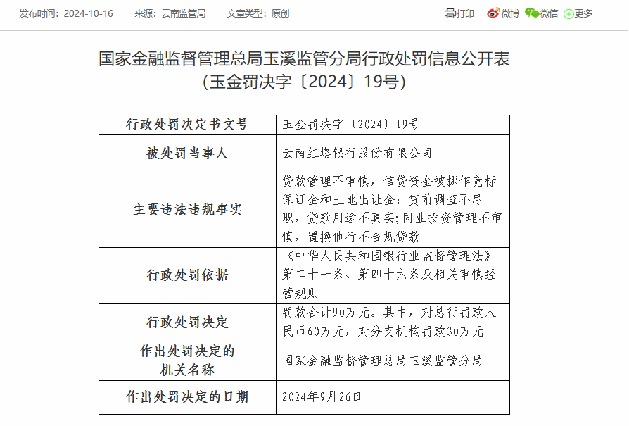 云南红塔银行被罚款合计90万:因贷款管理不审慎等 更新时间:2024-10-22 11:21:30 •阅读 0 财经10月22日讯 近日,国家金融监督管理总局玉溪监管分局行政处罚信息公开表显示,云南红塔银行因贷款管理不审慎,信贷资金被挪作竞标保证金和土地出让金;贷前调查不尽职,贷款用途不真实;同业投资管理不审慎,置换他行不合规贷款,被罚款合计90万元。其中,对总行罚款60万元,对分支机构罚款30万元。上述处罚决定作出的日期为2024年9月26日。 王擎宇