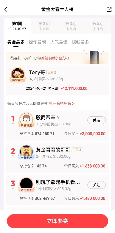 开赛首日,竞争激烈。第一名“黄金霸主”花落用户“Tony哥“,其买入金额高达 1200 万,第一天就将大冰箱和狗头金奖励收入囊中。数据显示,10月21日买金榜前50名累计买金1.9亿,前100名累计买金2.7亿,前十名都超过了500万,参赛热度空前高涨。