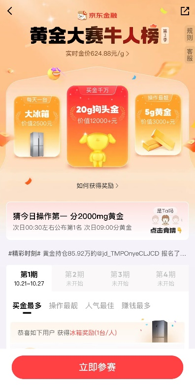 随着黄金热度的持续飙升,10月21日,京东金融平台的积存金用户迎来了黄金实盘大赛第三季。这场为期四周的实盘PK赛事,将持续到11月17日,为广大黄金投资者提供一个展示才华、交流经验的舞台。无论是投资新人还是资深老将,只要公开持仓信息和交易操作记录,都有机会在这场全国性的竞技中脱颖而出,赢取丰厚大奖。