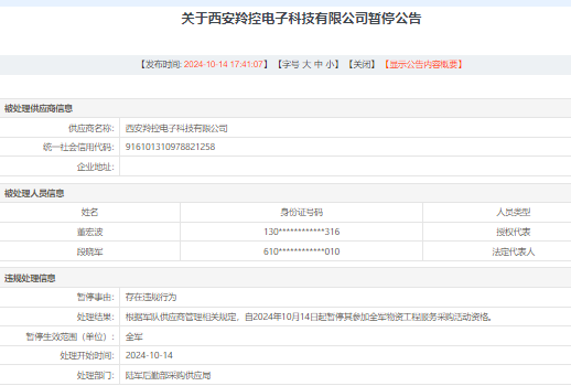 财经10月23日讯(记者 刘小菲军队采购网近期发布的消息显示,西安羚控电子科技有限公司(简称“羚控科技”存在违规行为,根据军队供应商管理相关规定,自2024年10月14日起暂停其参加全军物资工程服务采购活动资格。