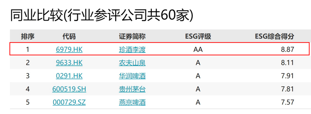 Wind ESG数据显示,截至10月17日,在已进行ESG评级的7938家上市公司中,仅有141家获得“AA级及以上”评级。珍酒李渡2024年ESG评级为“AA级”,综合得分8.87,在白酒和葡萄酒行业中排名第一。此外,在榜单“日常消费”板块中,珍酒李渡ESG综合得分亦排名第一。