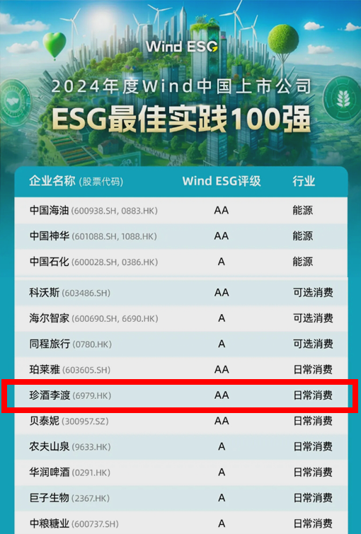 10月22日,知名金融信息服务商万得发布“2024年度Wind中国上市公司ESG最佳实践100强”,珍酒李渡凭借可持续发展领域的杰出表现再度上榜,连续第二年成为榜单唯一入选白酒企业。
