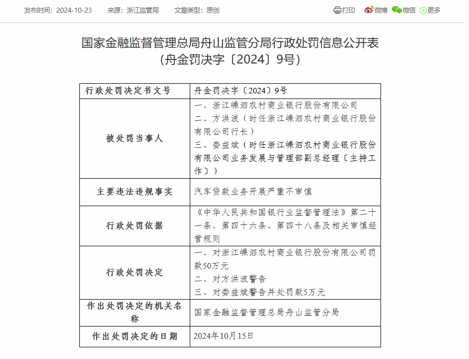 浙江嵊泗农商银行被罚50万:因汽车贷款业务开展严重不审慎 更新时间:2024-10-23 17:22:21 •阅读 0 财经10月23日讯 今日,国家金融监督管理总局舟山监管分局行政处罚信息公开表显示,浙江嵊泗农村商业银行因汽车贷款业务开展严重不审慎,被罚款50万元。上述处罚决定作出的日期为2024年10月15日。