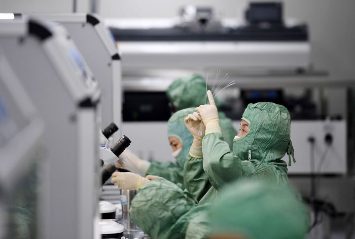 在赛诺医疗科学技术股份有限公司天津生产基地,工作人员在导管制备室车间组装球囊导管(2024年9月9日摄。新华社记者 赵子硕 摄
