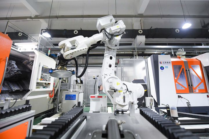 在浙江宁波江丰电子材料股份有限公司分析检测中心,工业机器人在自动化产线加工芯片靶材(2023年3月21日摄。新华社记者 翁忻旸 摄
