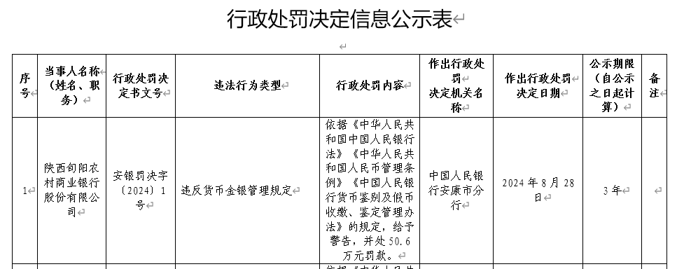 陕西旬阳农商银行被罚50.6万:因违反货币金银管理规定 更新时间:2024-10-25 18:21:54 •阅读 0 财经10月25日讯 近日,中国人民银行安康市分行行政处罚决定信息公示表显示,陕西旬阳农村商业银行因违反货币金银管理规定,被警告并罚款50.6万元。行政处罚决定作出的日期为2024年8月28日。