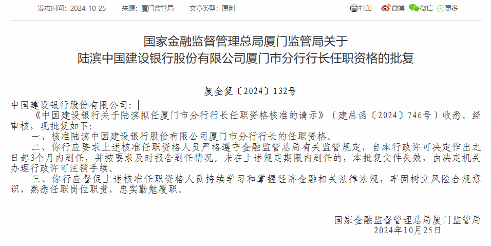 建设银行厦门市分行行长陆滨任职资格获批 更新时间:2024-10-28 16:21:25 •阅读 0 财经10月28日讯 日前,国家金融监督管理总局厦门监管局披露批复显示,国家金融监督管理总局厦门监管局核准陆滨中国建设银行股份有限公司厦门市分行行长的任职资格。