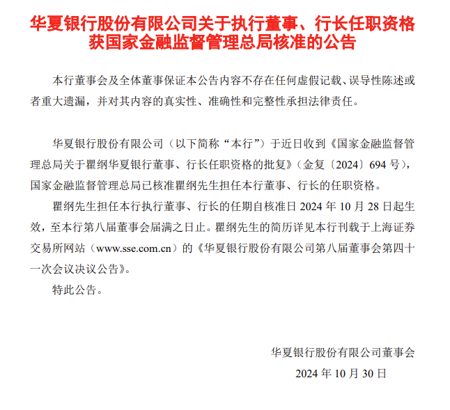 华夏银行:行长瞿纲任职资格获批 更新时间:2024-10-30 10:23:38 •阅读 0 财经10月30日讯 昨日,华夏银行发布公告显示,该行于近日收到《国家金融监督管理总局关于瞿纲华夏银行董事、行长任职资格的批复》(金复〔2024〕694号,国家金融监督管理总局已核准瞿纲担任该行董事、行长的任职资格。瞿纲担任华夏银行执行董事、行长的任期自核准日2024年10月28日起生效,至该行第八届董事会届满之日止。