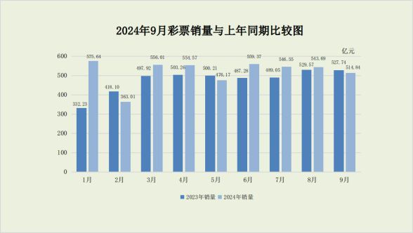 1-9月累计,全国共销售彩票4689.85亿元,同比增加404.50亿元,增长9.4%。其中,福利彩票机构销售1574.20亿元,同比增加128.82亿元,增长8.9%;体育彩票机构销售3115.65亿元,同比增加275.69亿元,增长9.7%。