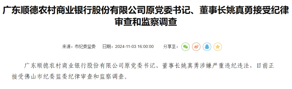 顺德农商银行原党委书记、董事长姚真勇被查 更新时间:2024-11-04 11:24:32 •阅读 0 财经11月4日讯 11月3日,佛山市纪委监委信息显示,广东顺德农村商业银行股份有限公司原党委书记、董事长姚真勇涉嫌严重违纪违法,目前正接受佛山市纪委监委纪律审查和监察调查。 张紫祎