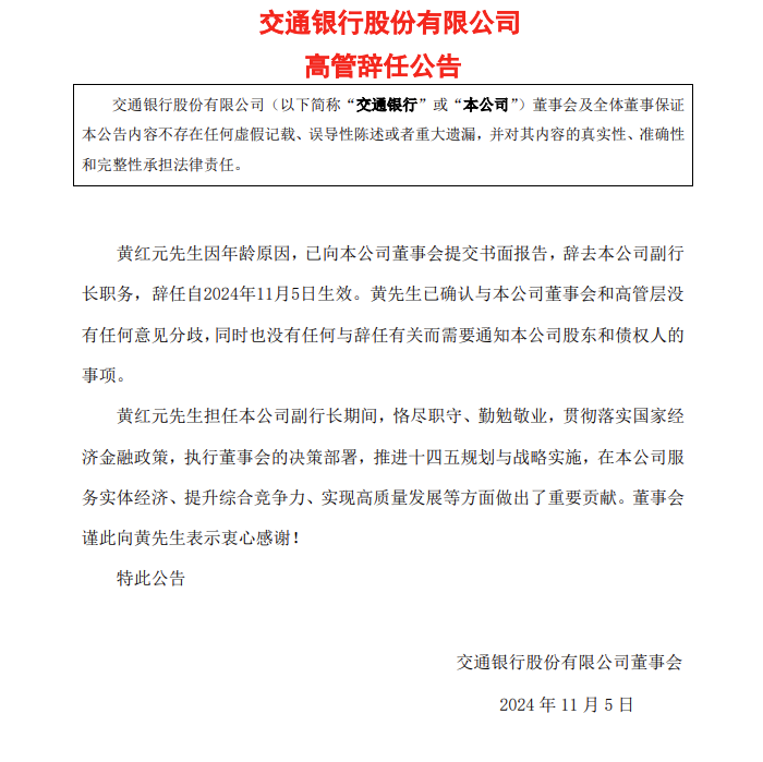 交通银行:副行长黄红元因年龄原因辞任 更新时间:2024-11-06 10:21:40 •阅读 0 财经11月6日讯 昨日,交通银行发布公告显示,黄红元因年龄原因,已向该公司董事会提交书面报告,辞去交通银行副行长职务,辞任自2024年11月5日生效。 张紫祎
