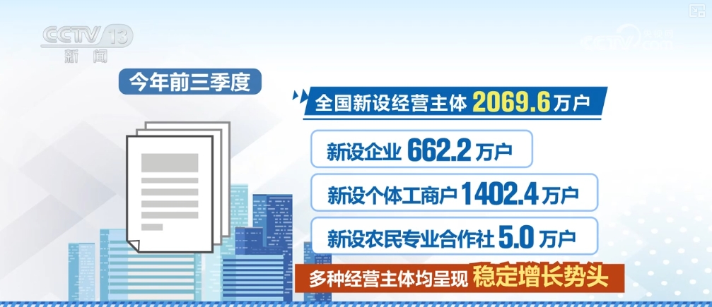 市场监管总局介绍,2024年前三季度,全国新设经营主体2069.6万户。其中,新设企业662.2万户,新设个体工商户1402.4万户,新设农民专业合作社5.0万户,多种经营主体均呈现稳定增长势头。